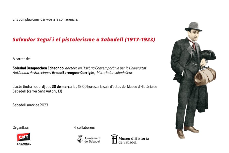 Conferència “Salvador Seguí i el pistolerisme a Sabadell (1917-1921)” que va tenir lloc al Museu Història de Sabadell (MHS), organitzada per la CNT. Soledad Bengochea va tractar la biografia de Salvador Seguí i jo vaig parlar sobre el pistolerisme a Sabadell. Aquí deixo les principals idees de la xerrada i la bibliografia utilitzada.